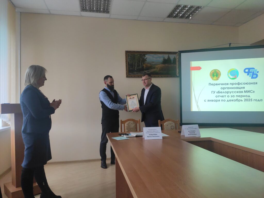 В завершении отчетного собрания директор ГУ «Белорусская МИС» Астрейко Николай Анатольевич вручил благодарность Бабаку Юрию Николаевичу за добросовестный труд, образцовое выполнение должностных обязанностей, за руководство первичной профсоюзной организацией и активную работу по защите социально-трудовых прав и интересов членов Профсоюза в учреждении ГУ «Белорусская МИС».